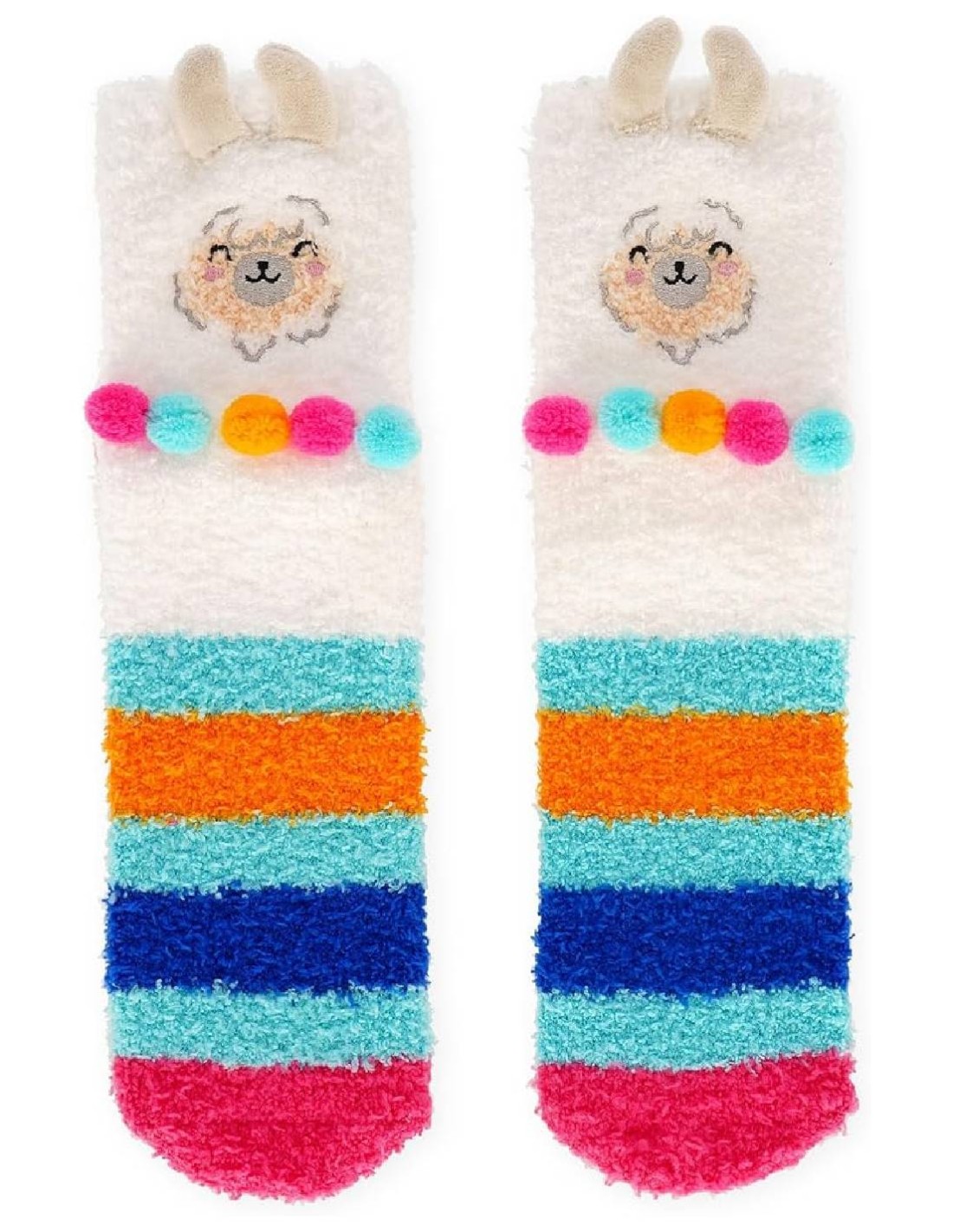 The It's A Match Llama Non-Slip Socks Legami Size 35/42 combine warmth, comfort, and a cheerful touch of fun. Made from soft, fluffy fabric, they keep your feet cozy and comfortable, perfect for chilly winter days or relaxing moments at home. The playful llama design is full of charming details, featuring 3D ears, an embroidered smiling face, and a row of colorful pom-poms that make these socks truly unique. The bright multicolor stripes in shades of pink, blue, orange, and turquoise add a lively and joyful look that brings instant happiness. The non-slip rubber grips on the soles ensure stability and safety on all surfaces, while the one-size fit (35/42) provides flexibility and comfort for different foot sizes. Perfect as a gift idea for anyone who loves cozy and playful accessories, the It's A Match Llama Non-Slip Socks bring a splash of color and fun to every day. Soft, warm, and irresistibly cute, they turn every step into a little moment of happiness and comfort emdash; perfect for relaxing, reading, or simply enjoying a cozy day indoors.