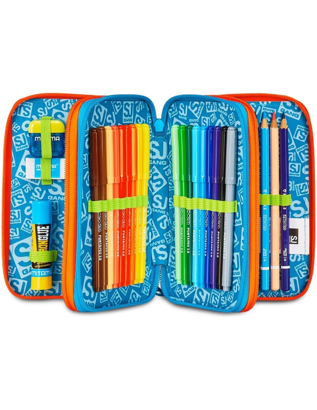 Inside, the pencil case includes a total of 45 pieces to tackle every school task: 1 blue erasable pen, 1 red ballpoint pen, 18 hexagonal colored pencils, 18 super-washable markers with 3.0 mm tips, 1 HB graphite pencil, 1 colored glue stick, 1 white eraser with printed cover, 1 double-hole barrel sharpener, 1 transparent ruler, 1 red/blue bicolor pencil, and 1 pair of metal scissors.