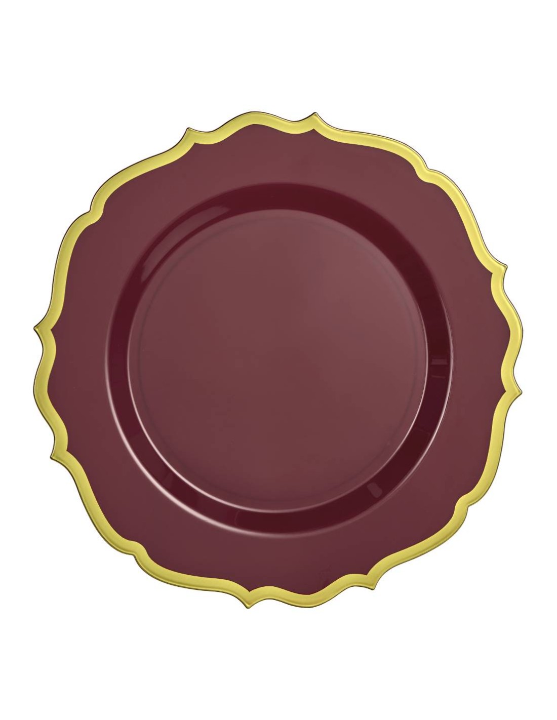 Casa Della CartaBring elegance and style to your table with the Set of 10 Burgundy Plastic Plates with Gold Rim 26cm, perfect for adding a touch of sophistication to any occasion. The deep burgundy color blends beautifully with the golden edge, creating a luxurious and festive look ideal for Christmas dinners, weddings, and formal gatherings. Made from high-quality rigid plastic, these plates are sturdy, durable, and stylishemdash;offering both practicality and refinement. The shimmering gold rim adds a festive touch, while the smooth surface enhances the visual appeal of every dish served. Their elegant, slightly scalloped design makes them ideal for any table setup, pairing wonderfully with gold cutlery, white tablecloths, or themed decorations. Reusable and easy to clean, they combine beauty and sustainability, making them a smart choice for those who love attention to detail. The Set of 10 Burgundy Plastic Plates with Gold Rim is perfect for anyone who wants to turn every meal into a moment of elegance and warmth, adding style and charm to any celebration.enbsp;