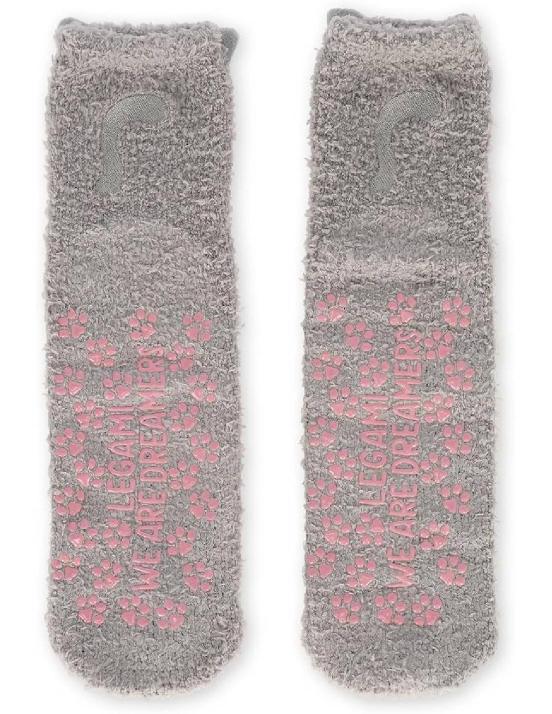 Il design ispirato a un tenero gattino grigio con orecchiette in rilievo e musetto ricamato rende questi calzini irresistibilmente carini e ideali per chi ama lo stile kawaii e i dettagli originali. La suola è dotata di gommini antiscivolo con impronte e scritta Legami We Are Dreamers in rosa, che garantiscono stabilità e sicurezza su qualsiasi superficie, senza rinunciare allo stile.