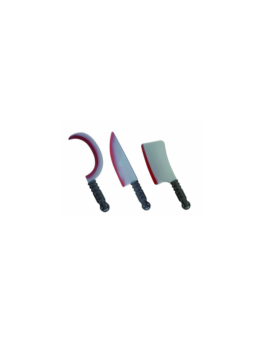 Il set include un assortimento di coltelli finti che sembrano appena usciti da una scena di un film dell'orrore, scegli il tuo preferito! Ogni arma, lunga 35 cm, è realizzata in plastica resistente e presenta un dettagliato effetto insanguinato che simula perfettamente schizzi di sangue per un impatto visivo davvero spaventoso.