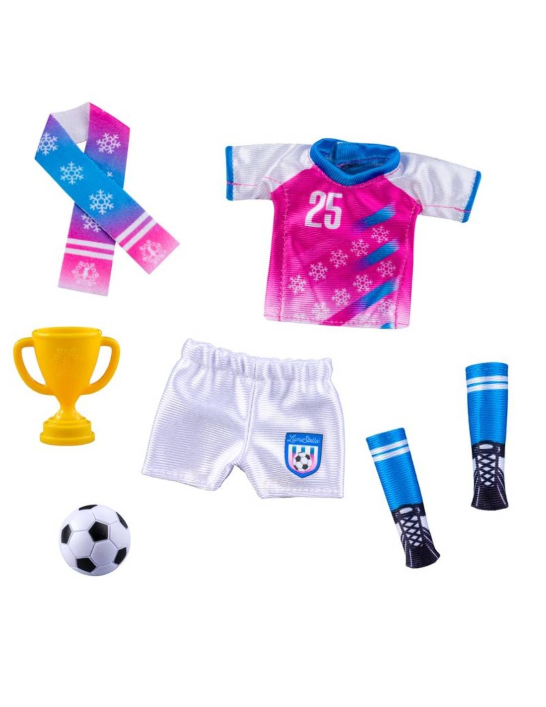 Contiene 11 pezzi: maglia, pantaloncini, calzettoni, sciarpa, pallone, coni, rete, trofeo e sfondo decorativo. Elfo non incluso.