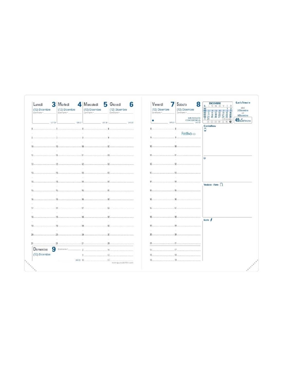 Agenda settimanale con presentazione della settimana su due pagine, per una visione panoramica immediata. Ogni settimana include uno spazio libero per annotare promemoria, appuntamenti e attività.