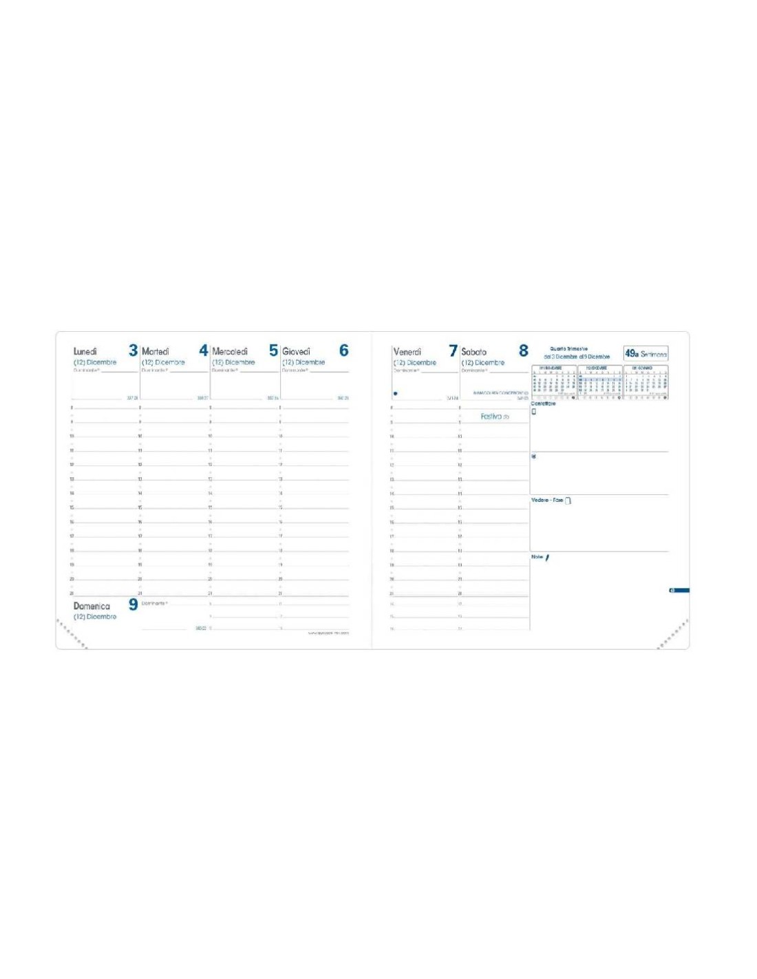 Agenda settimanale con presentazione della settimana su due pagine, per una visione panoramica immediata. Include spazi dedicati per appunti giornalieri e promemoria.