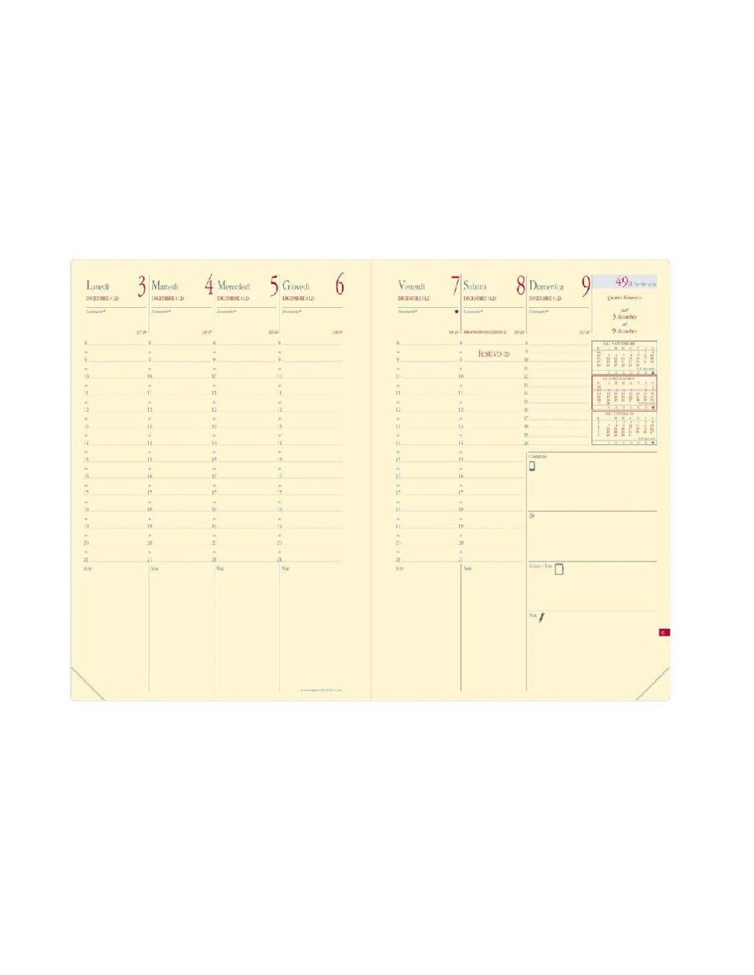 Agenda settimanale con presentazione della settimana su due pagine, per una visione panoramica immediata. Ogni settimana include uno spazio libero per annotare promemoria, appuntamenti e attività.