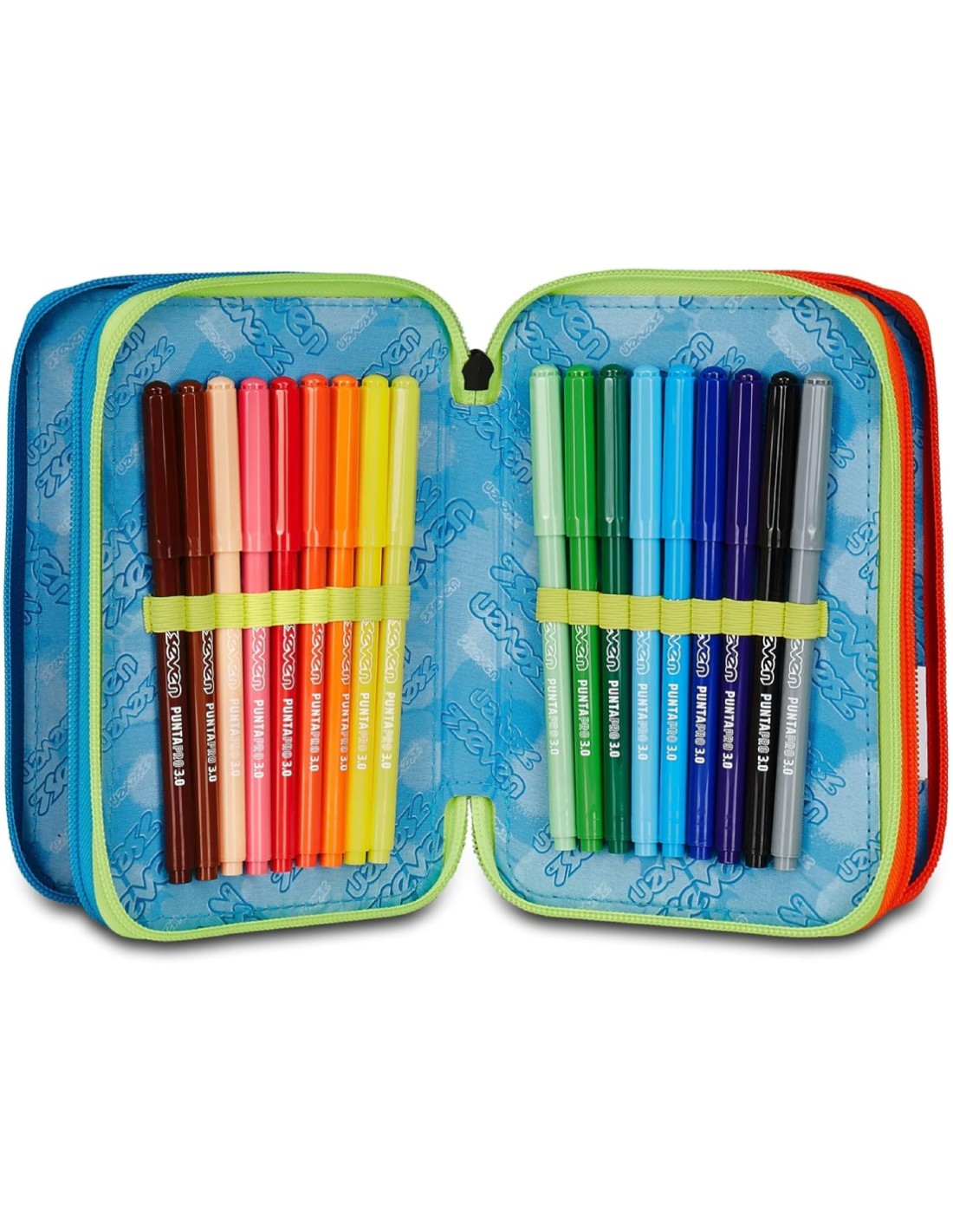Al suo interno, l’astuccio contiene ben 45 pezzi per affrontare al meglio ogni attività: 1 penna cancellabile blu, 1 penna a sfera rossa, 18 pastelli a colori esagonali, 18 pennarelli superlavabili punta 3.0, 1 matita HB, 1 colla colorata, 1 gomma con cartoncino stampato, 1 temperino a doppio foro, 1 righello trasparente, 1 matita bicolor rosso/blu e 1 paio di forbici in metallo.