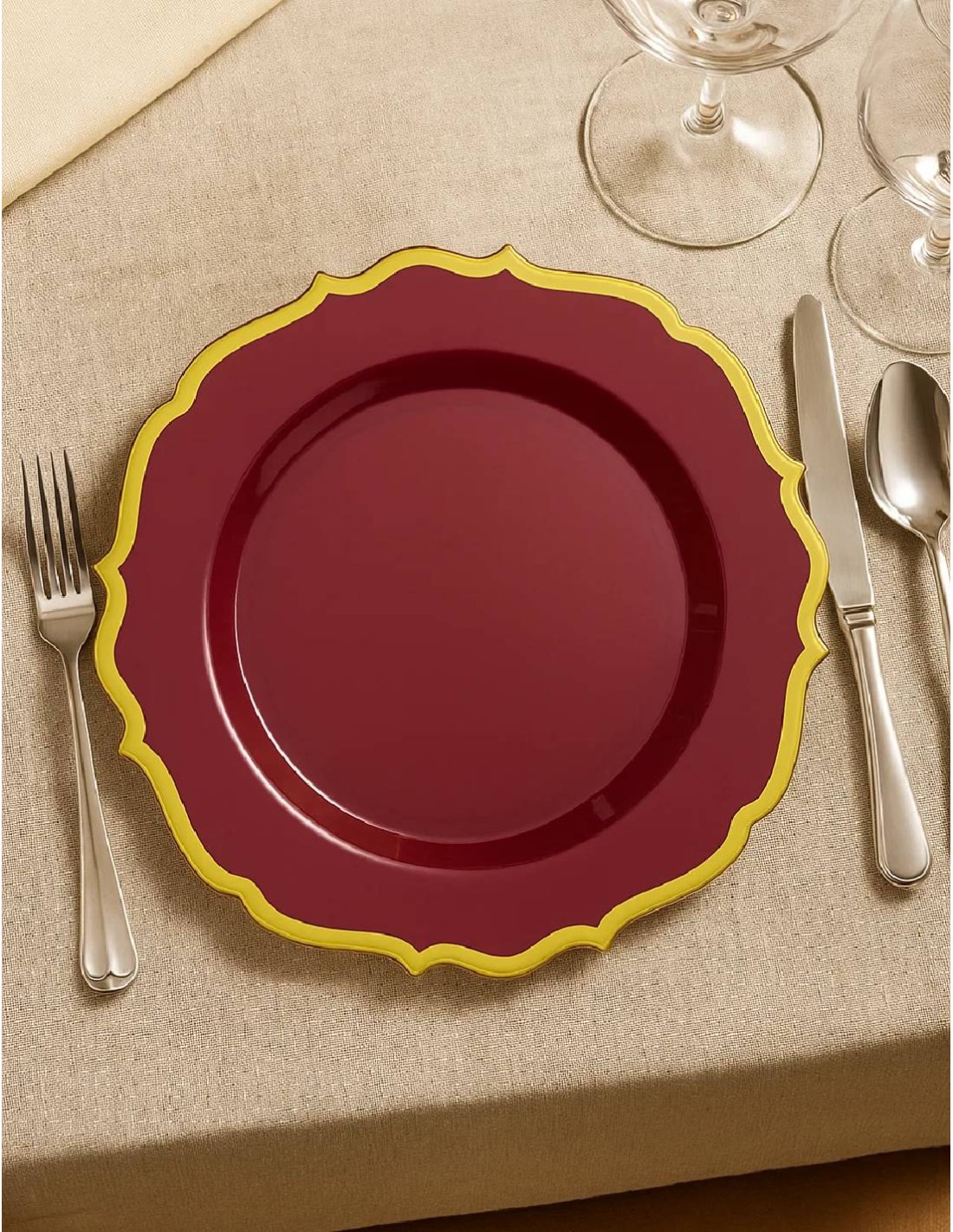 Realizzati in plastica rigida di alta qualità, questi piatti uniscono bellezza e funzionalità. Resistenti e durevoli, sono ideali sia per eventi formali che per feste in famiglia, offrendo stabilità e comodità senza rinunciare allo stile. Il bordo dorato lucido aggiunge un tocco festivo, perfetto per cene natalizie, ricevimenti, matrimoni o banchetti eleganti.