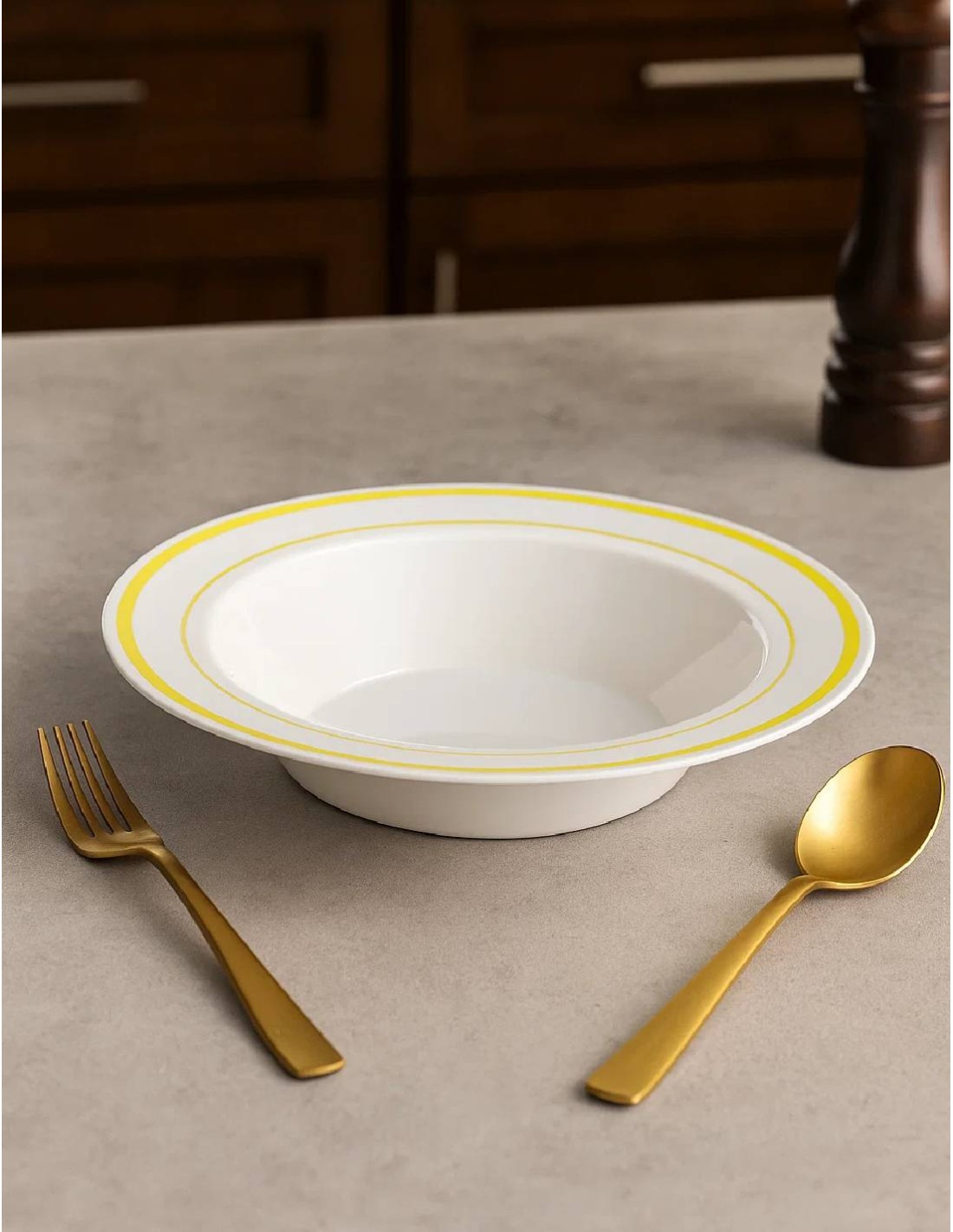Realizzate in plastica rigida di alta qualità, garantiscono robustezza e stabilità, resistendo a pietanze calde o fredde senza deformarsi. Il loro elegante colore bianco, impreziosito da un bordo dorato lucido, conferisce un tocco di classe e luminosità alla tavola, perfetto per eventi come matrimoni, cene di gala, feste natalizie o semplici serate in compagnia.